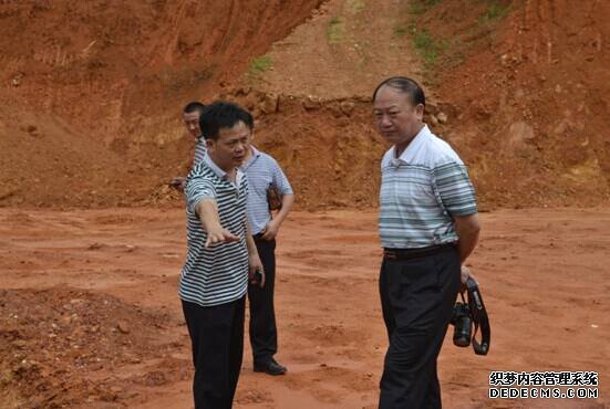 李远西同志(右)在施工地听取三江县森林公安局局长吴家秀(左)的基础设施建设情况汇报。