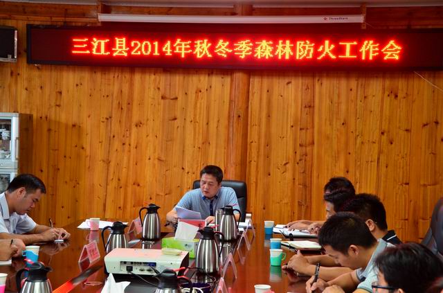 9月19日上午,三江县2014年度全县秋冬季森林防火工作会议在县政府五楼会议室召开,全面部署今年秋冬季森林防火工作。宣传部、武装部、消防大队、司法局、教育局、民政局、财政局、林业局、森林公安、公安局、卫生局、环保局、广电局、气象局、牛浪坡林场等县森林防火指挥部全体成员单位、各乡(镇)分管森林防火的领导以及县森林防火指挥部办公室全体成员共35人参加会议。县森林防火指挥部常务副指挥长、副县长赖军出席会议,会议由县人民政府办公室副主任龙通明主持。