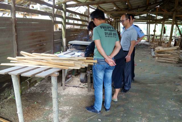 图为:检查组在林业加工企业检查安全生产工作情况。